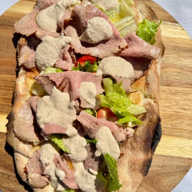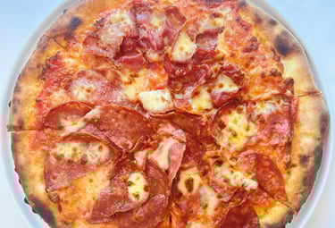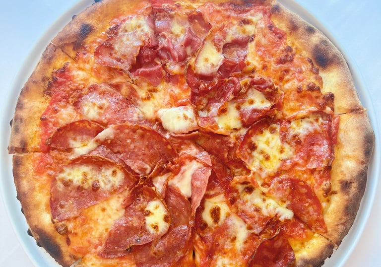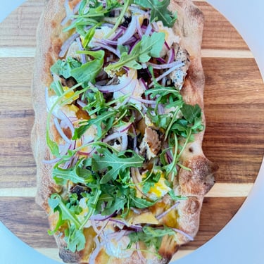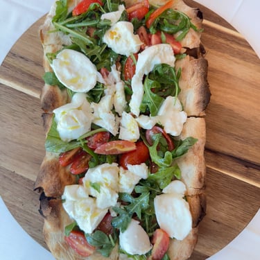 Our pizzas are crafted in the traditional 'la pizza a ruota di carro' style (a cart wheel), baked to perfection in our state-of-the-art Moretti Forni oven, using stone-ground organic flour imported from Italy for an authentic and flavorful experience. This crispy, thin style of pizza is a pure expression of just a few simple ingredients.